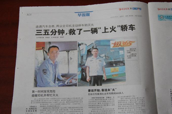 伸出援手的是公交公司3路車駕駛員商向陽和124路車駕駛員曹玉國(guó),兩人齊表示,只是恰好路過看到伸出援手而已,都是應(yīng)該做的。商向陽介紹:“自燃轎車的司機(jī)是女性,當(dāng)時(shí)她都沒有發(fā)現(xiàn)引擎蓋冒濃煙,公交車底盤高,我一扭頭就看到了,當(dāng)時(shí)事發(fā)鬧市區(qū),萬一燃燒起來引發(fā)爆炸之類的就太危險(xiǎn)了,于是我把公交車靠路邊停下,拎著滅火器就下來幫忙了?!辈苡駠?guó)當(dāng)時(shí)駕駛著124路公交車看到這一幕,也緊跟著拎著滅火器下車幫忙。火撲滅后,兩位司機(jī)便回到公交車上開車離開了。