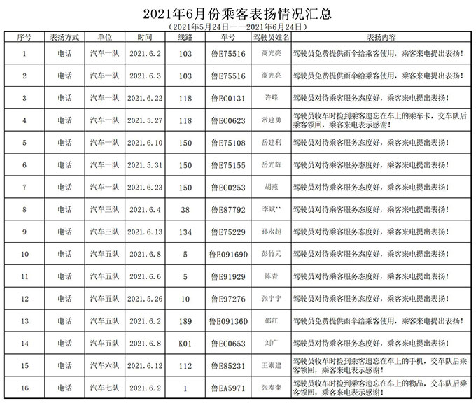 近段時間以來,廣大駕駛員按照公司的部署,在做好疫情防控的同時,積極投身公交服務質量提升工作。經(jīng)過持續(xù)不斷的努力,公交服務質量明顯提高,涌現(xiàn)了一大批的好人好事,受到乘客的好評。為繼續(xù)提高工作積極性,形成“比、學、趕、幫、超”的良好氛圍,現(xiàn)將2021年5月24日至2021年6月24日期間通過公交服務熱線受到乘客表揚的駕駛員予以通報。
