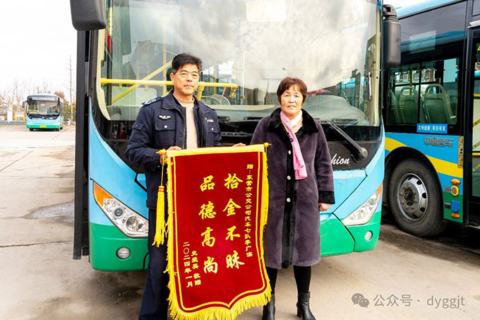 2024年1月19日,失主史女士及家人將一面繡著“拾金不昧 品德高尚”的錦旗送至市公交集團汽車七隊李廣濱師傅手中,感謝李廣濱師傅歸還遺失手提包的感人事跡。