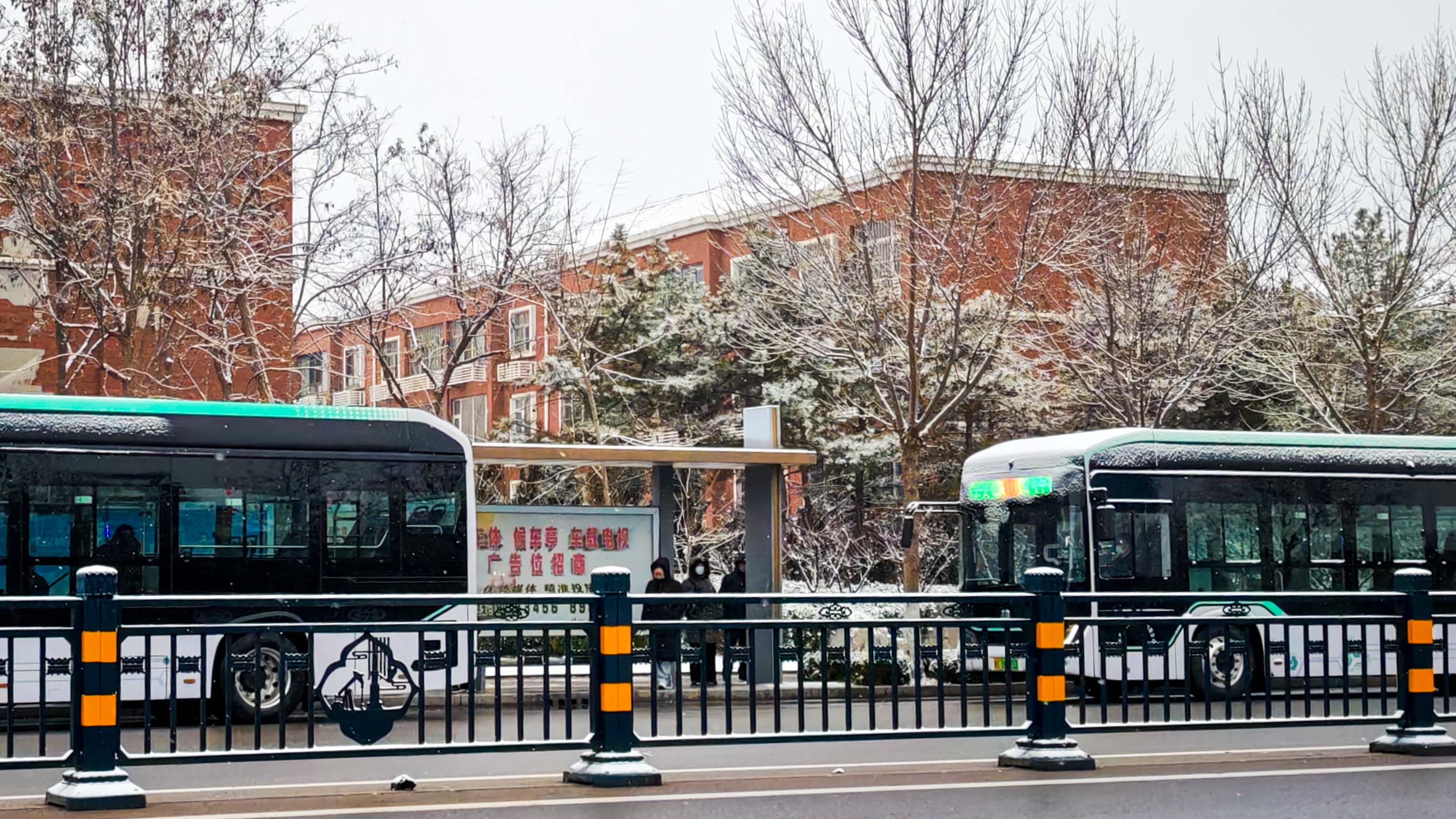 車行緩慢。雪落在擋風(fēng)玻璃上,雨刮器有節(jié)奏地擺動;后視鏡里,城市正一點點蘇醒。經(jīng)過學(xué)校、醫(yī)院、居民區(qū),站臺上,有人跺腳取暖,有人呵手張望。車停穩(wěn)后,車門打開,一團(tuán)熱氣撲面而來——“您好,請坐穩(wěn)扶好。”