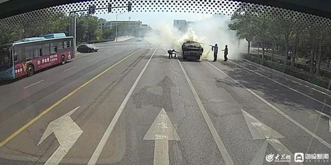 9月10日13點(diǎn)03分,東營公交通勤車隊(duì)駕駛員王維明像往常一樣執(zhí)行124路公交車運(yùn)營任務(wù),當(dāng)他駕車行駛到沂州路與瀏陽河路交叉口紅綠燈時,發(fā)現(xiàn)了異常情況——前方一輛貨車起火了,王師傅沒有絲毫畏懼,立即停車開門,提起車載滅火器沖下了車。